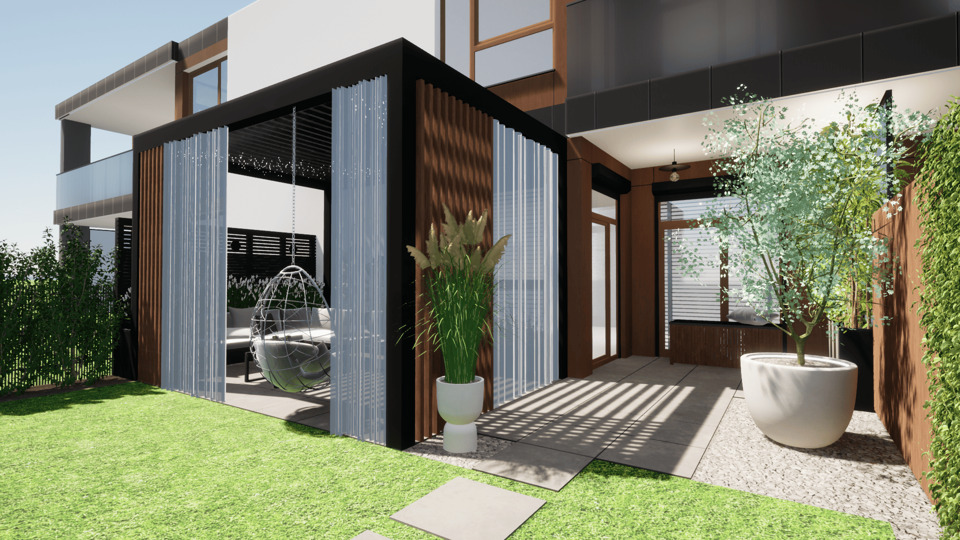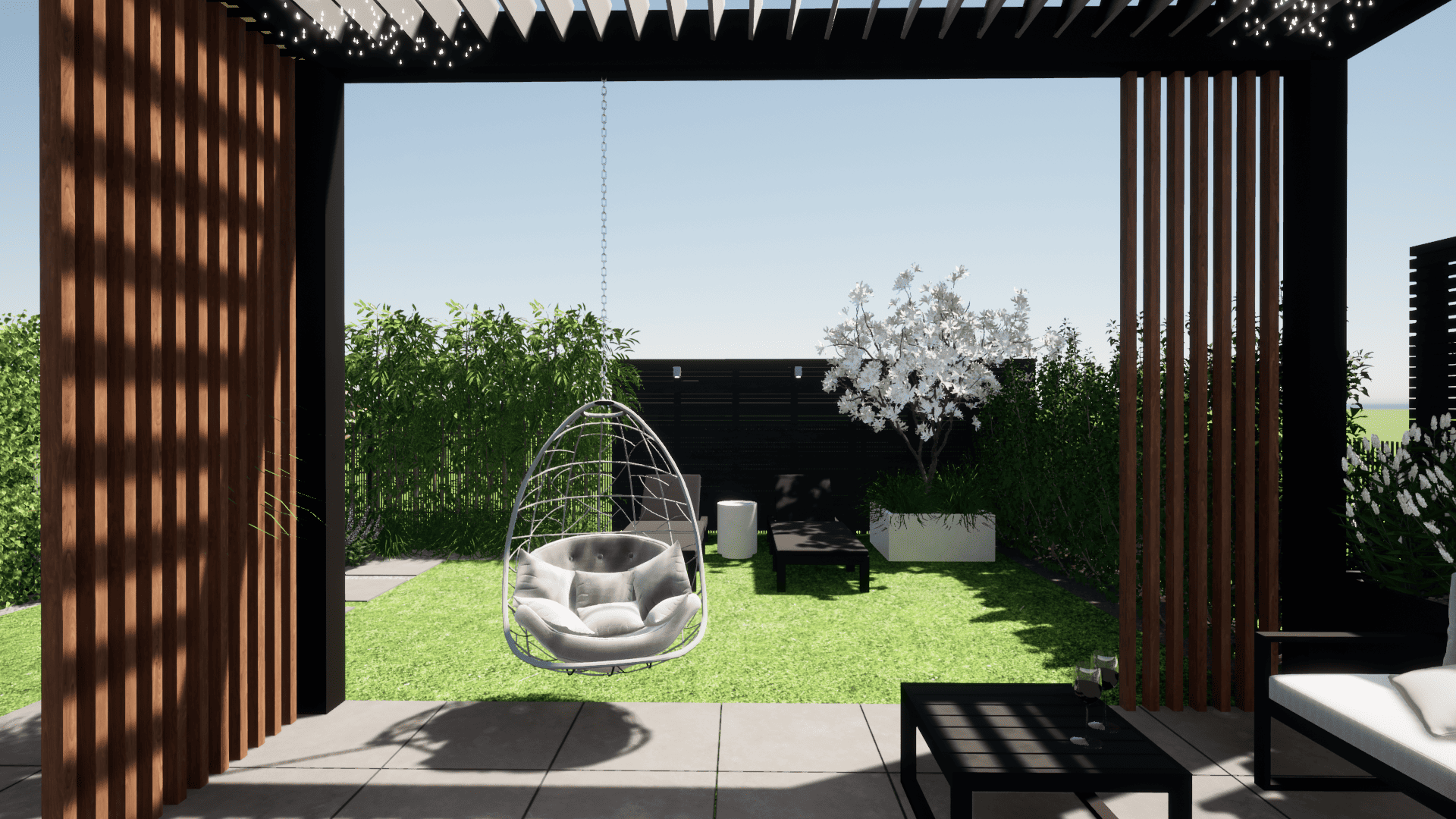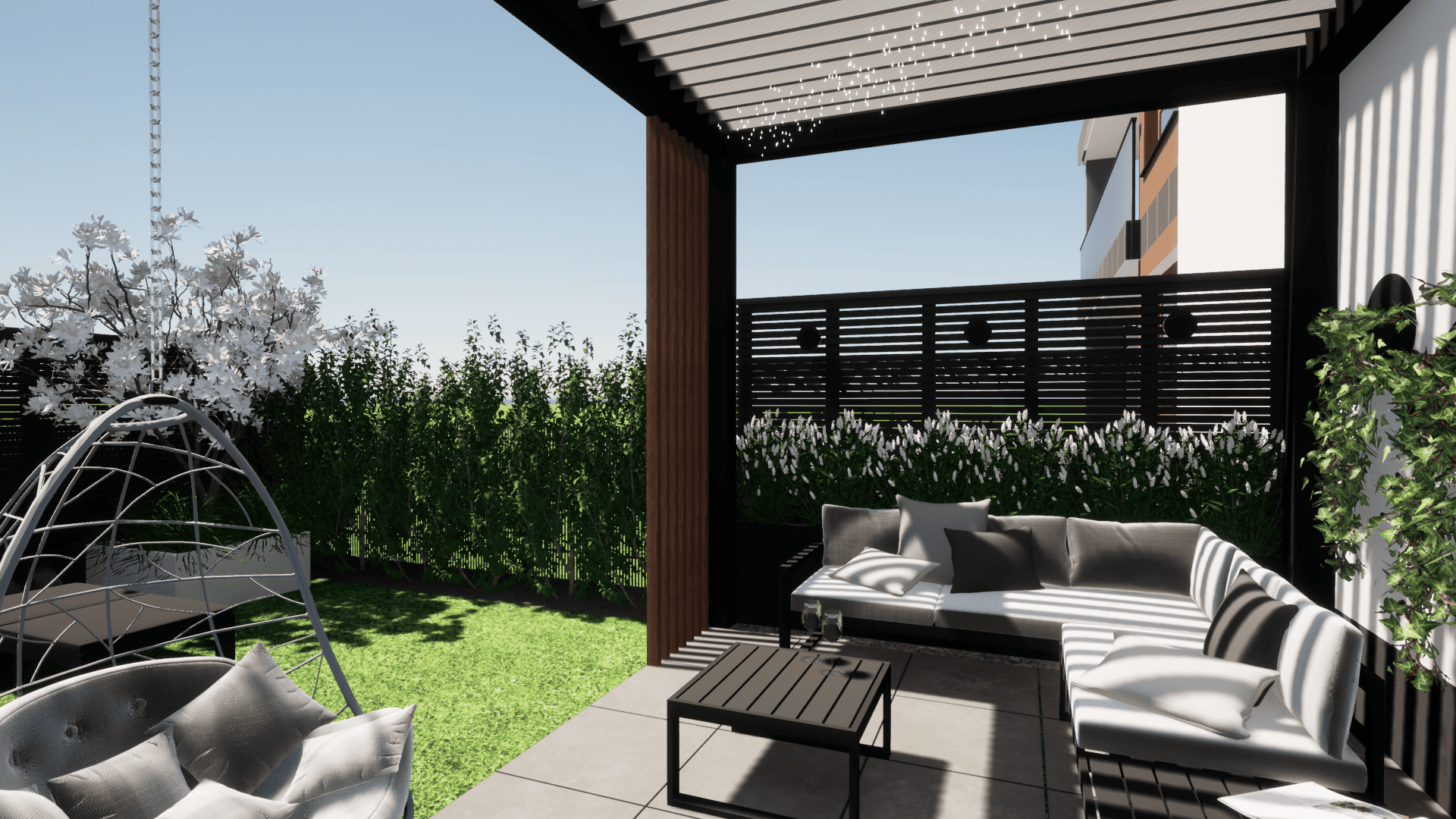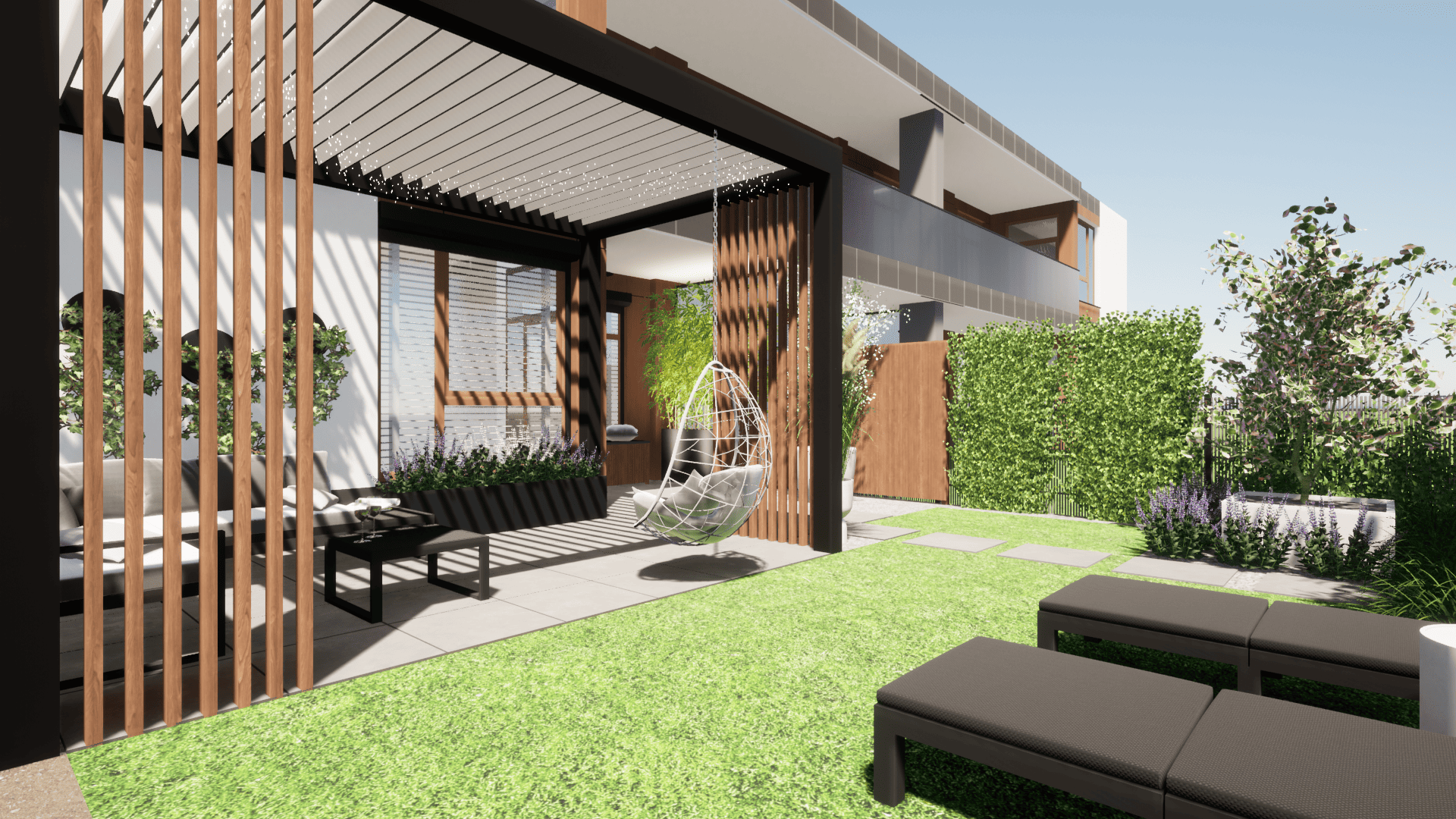 w którym ograniczeniem projektowym było zaledwie 25cm głębokości ziemi ze względu na podziemny parking. Projekt małej architektury został dostosowany do istniejących warunków tak aby osiągnąć zamierzony pomysł inwestora przy zachowaniu ograniczeń dewelopera. Ogród przylega do ciągów komunikacyjnych na osiedlu dlatego ważną kwestią było stworzenie miejsca prywatnego, osłoniętego od widoku, gdzie będzie można się zrelaskować i wypocząć.