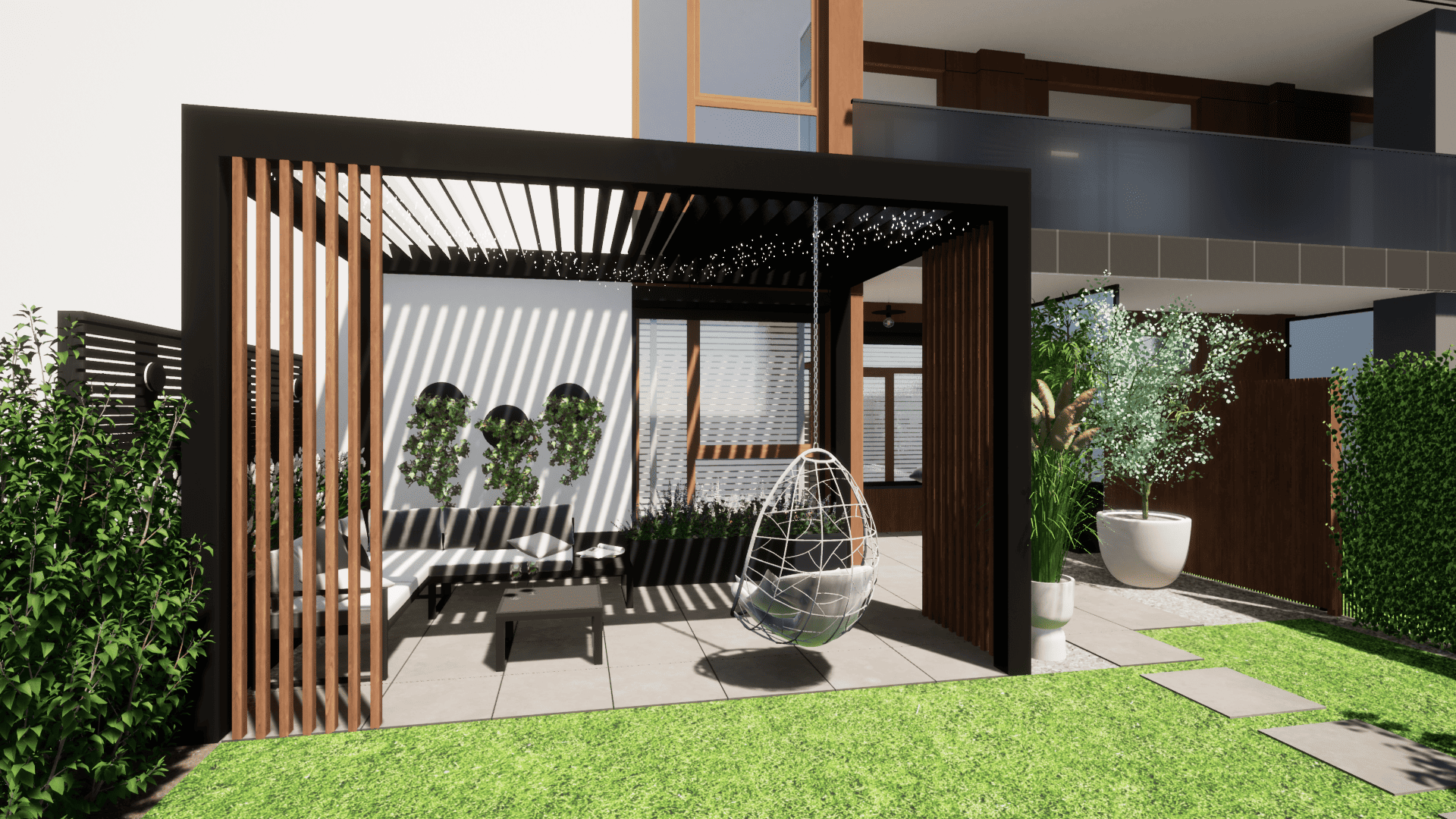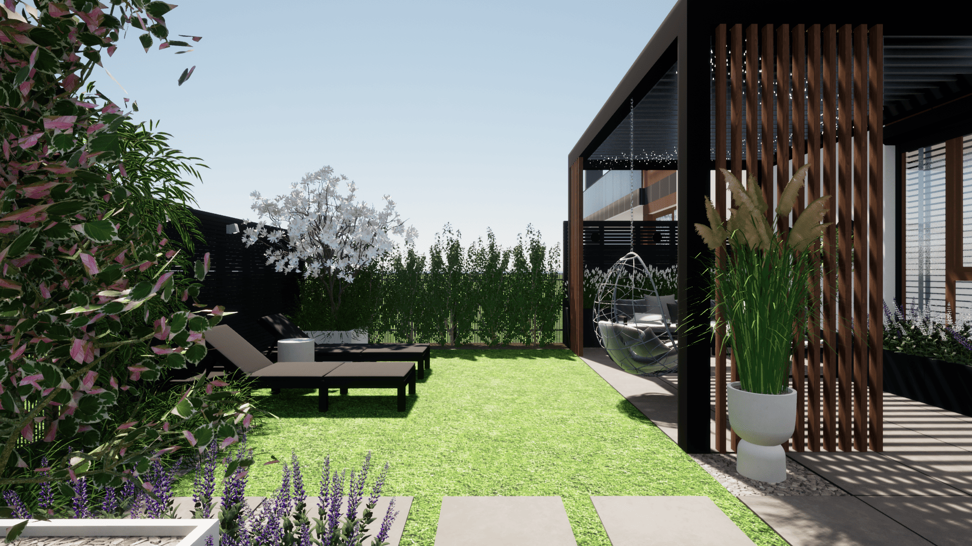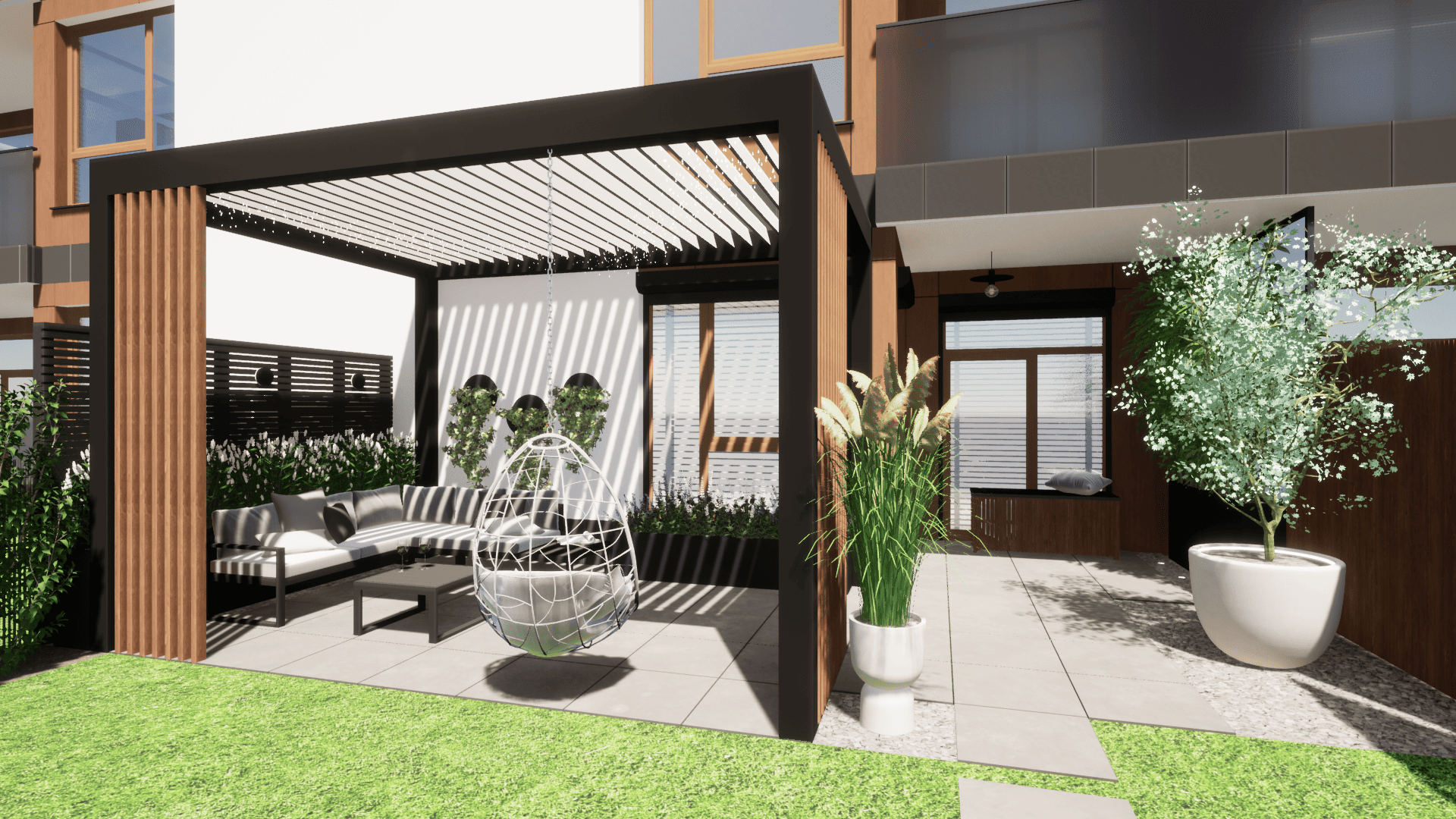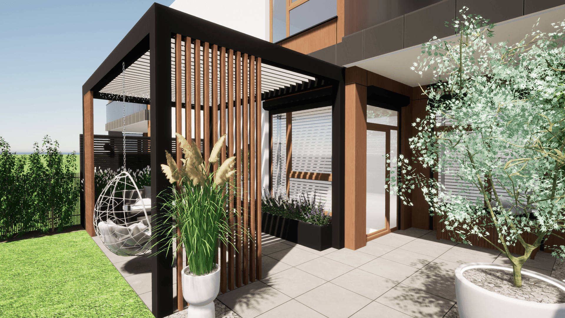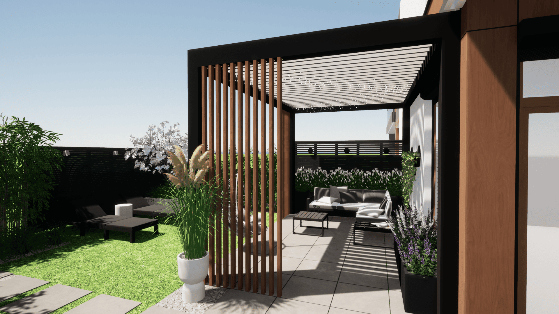 w którym ograniczeniem projektowym było zaledwie 25cm głębokości ziemi ze względu na podziemny parking. Projekt małej architektury został dostosowany do istniejących warunków tak aby osiągnąć zamierzony pomysł inwestora przy zachowaniu ograniczeń dewelopera. Ogród przylega do ciągów komunikacyjnych na osiedlu dlatego ważną kwestią było stworzenie miejsca prywatnego, osłoniętego od widoku, gdzie będzie można się zrelaskować i wypocząć.