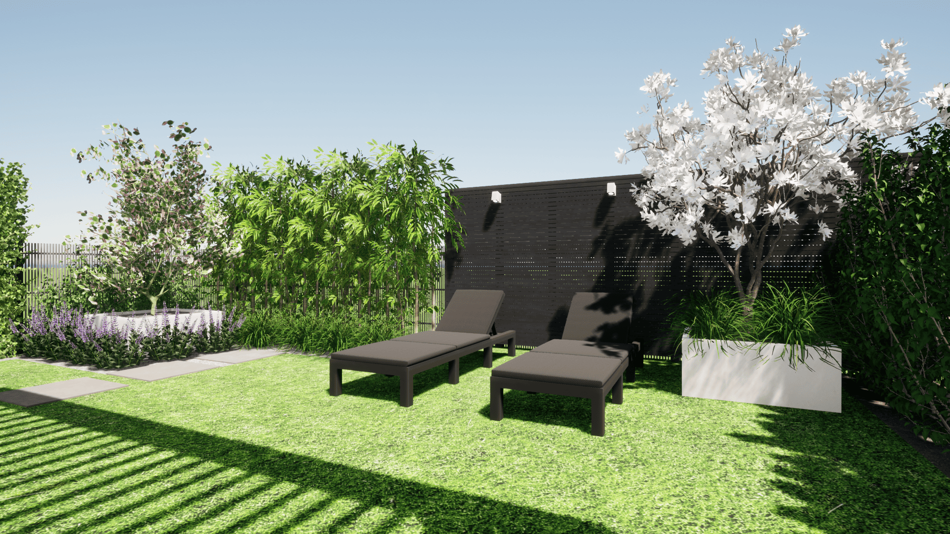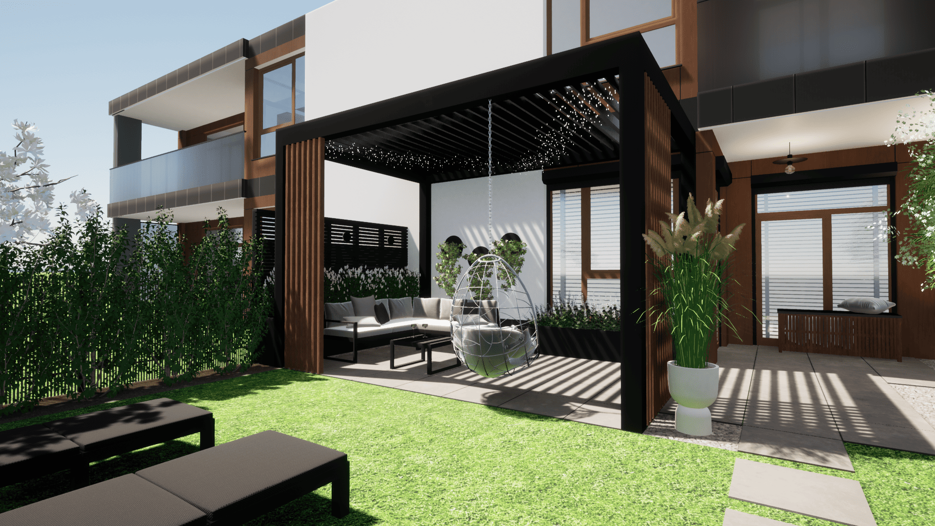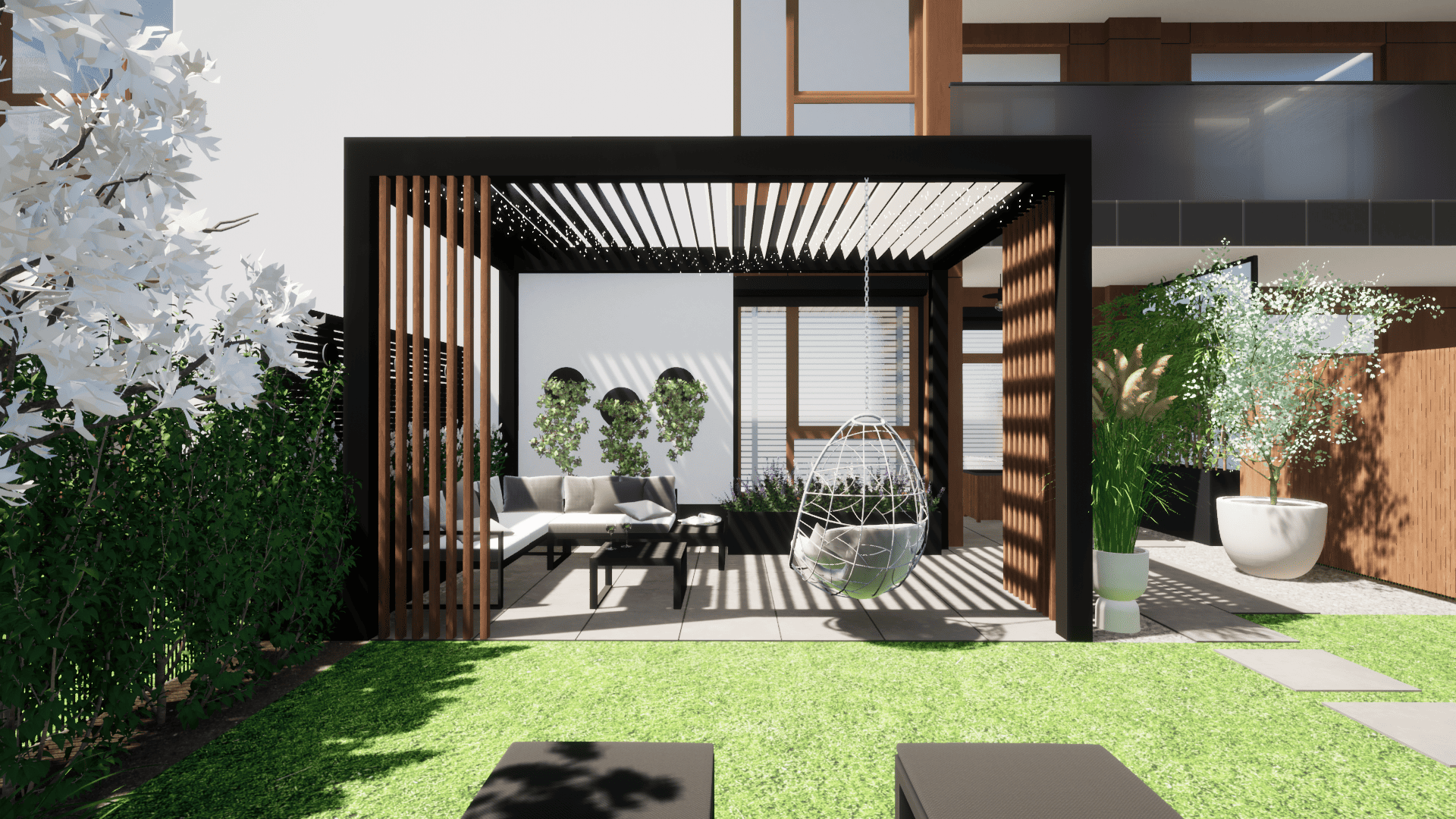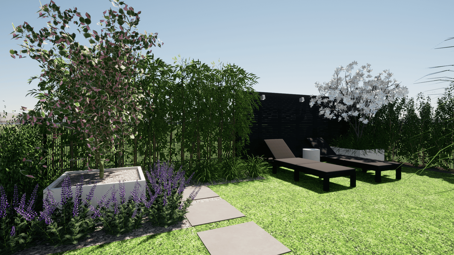 w którym ograniczeniem projektowym było zaledwie 25cm głębokości ziemi ze względu na podziemny parking. Projekt małej architektury został dostosowany do istniejących warunków tak aby osiągnąć zamierzony pomysł inwestora przy zachowaniu ograniczeń dewelopera. Ogród przylega do ciągów komunikacyjnych na osiedlu dlatego ważną kwestią było stworzenie miejsca prywatnego, osłoniętego od widoku, gdzie będzie można się zrelaskować i wypocząć.