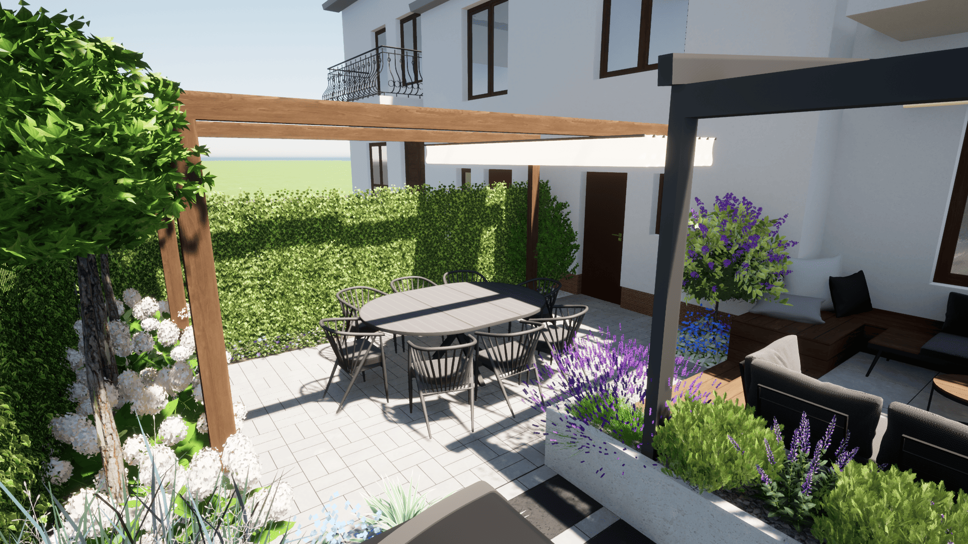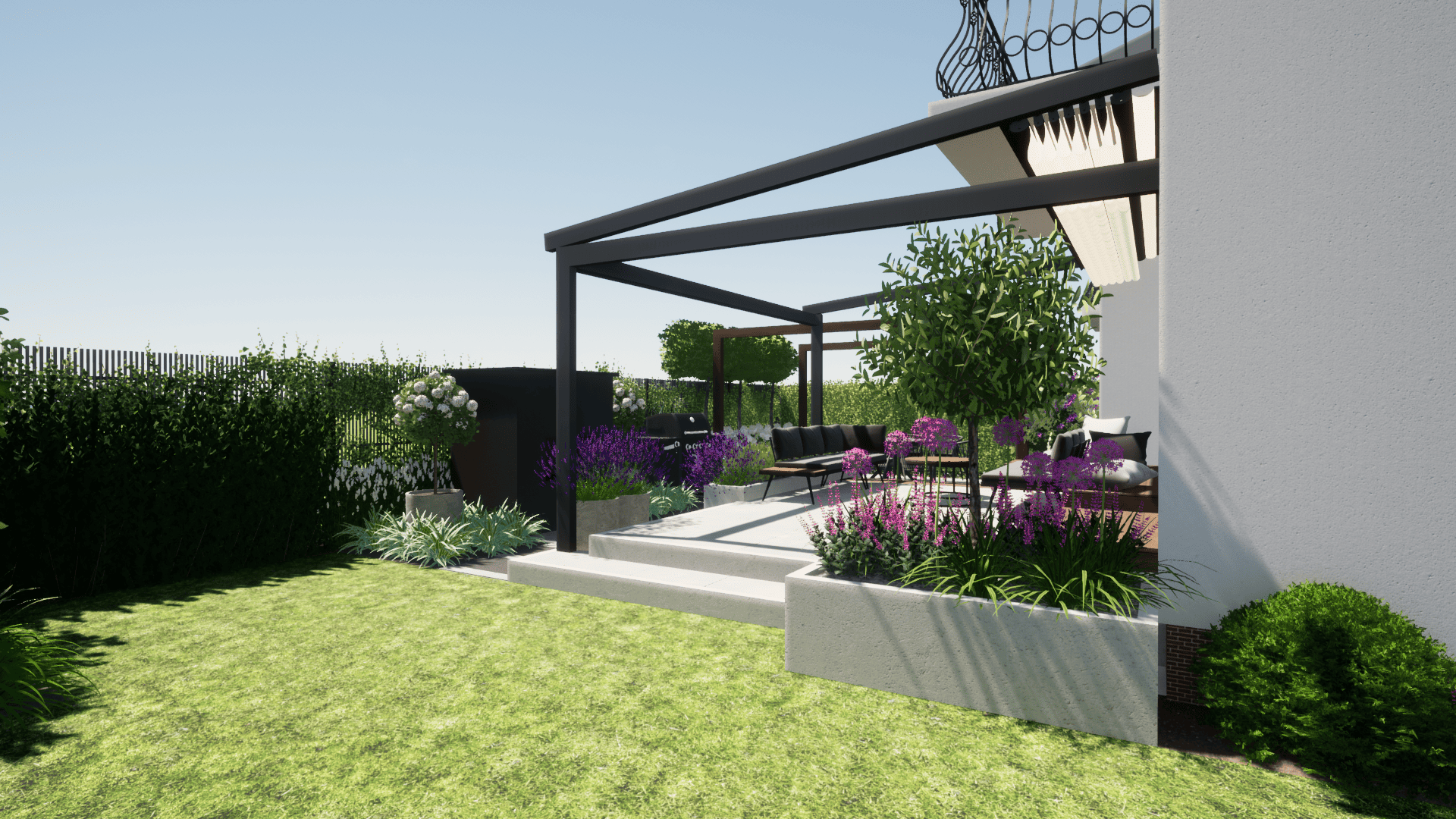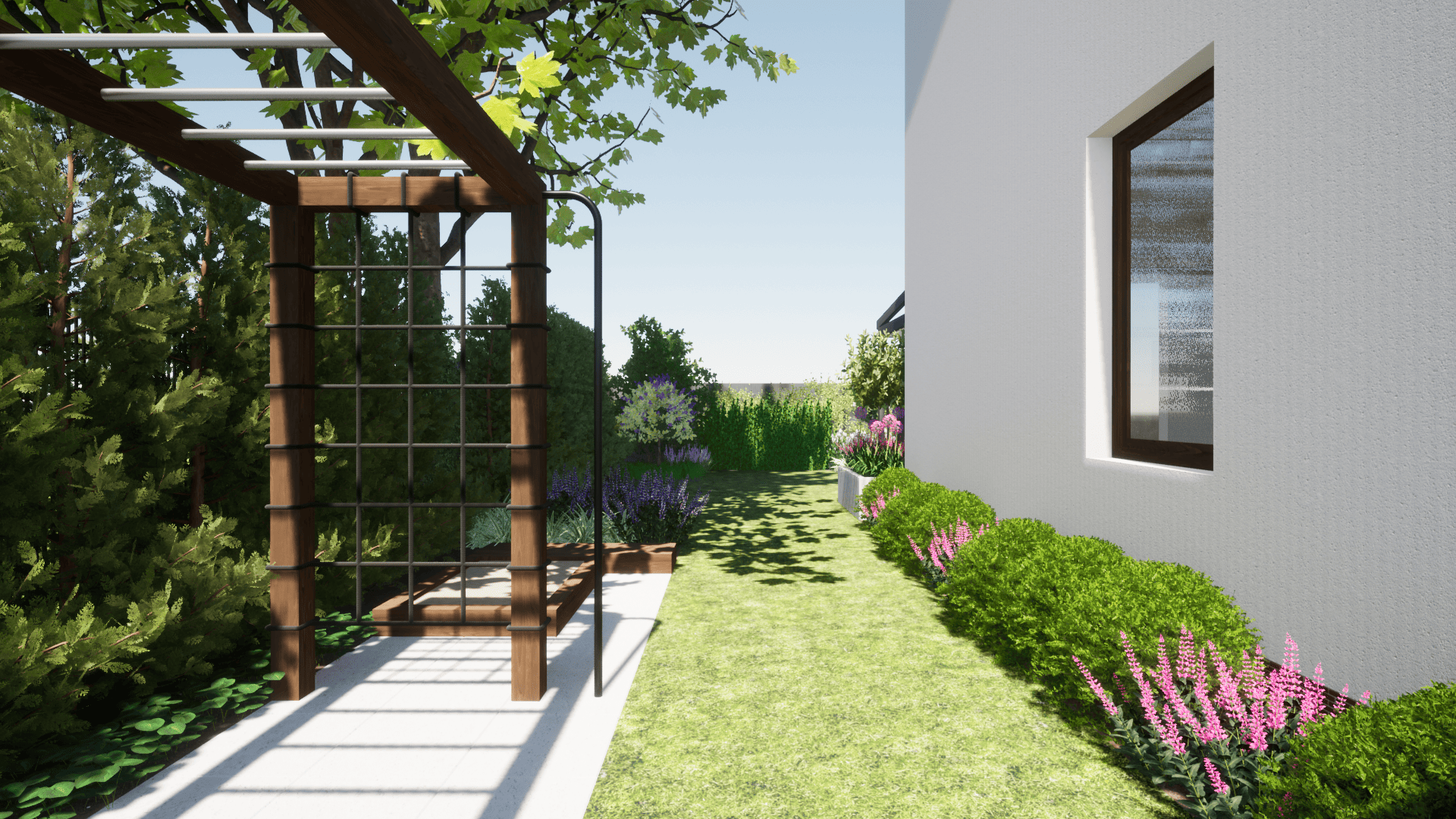 Opis: narożny ogród w zabudowie szeregowej, w której podstawowym wymogiem było zachowanie istniejącego tarasu w jego obrysie wraz z pergolą i przylegającym kominkiem.