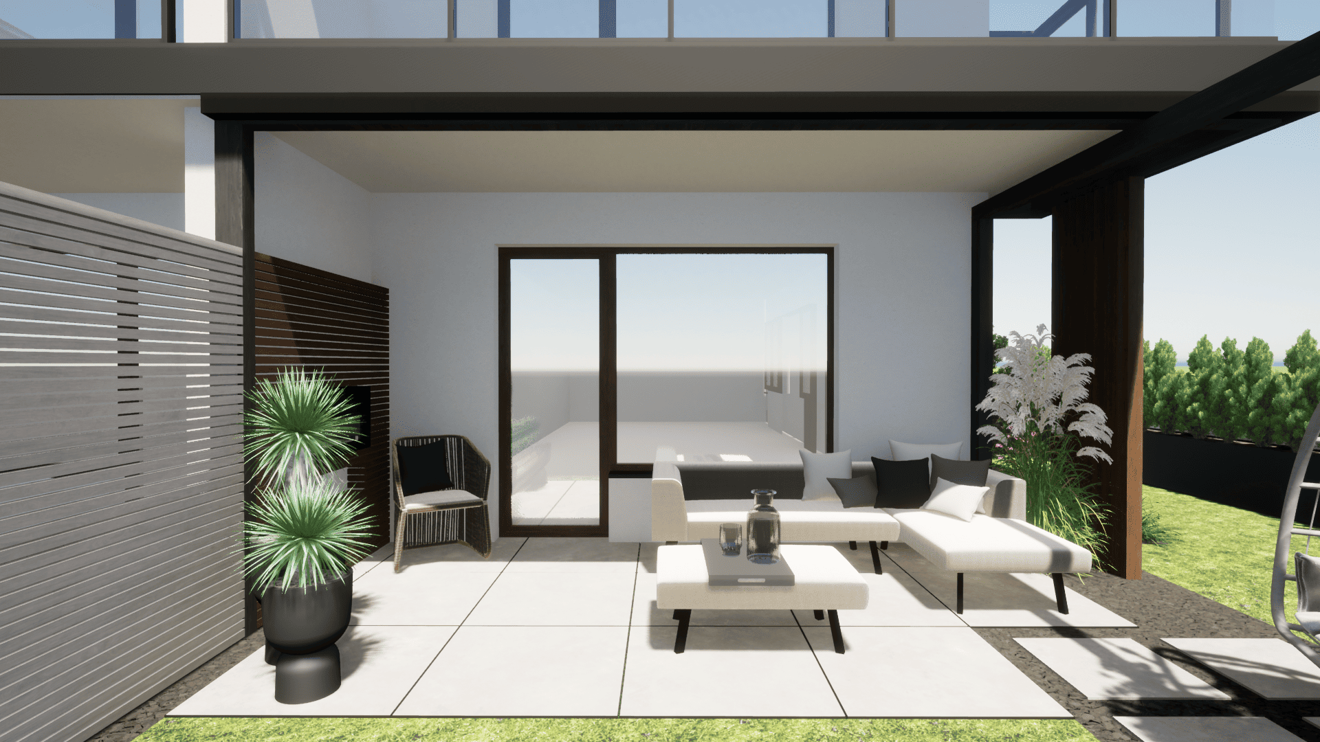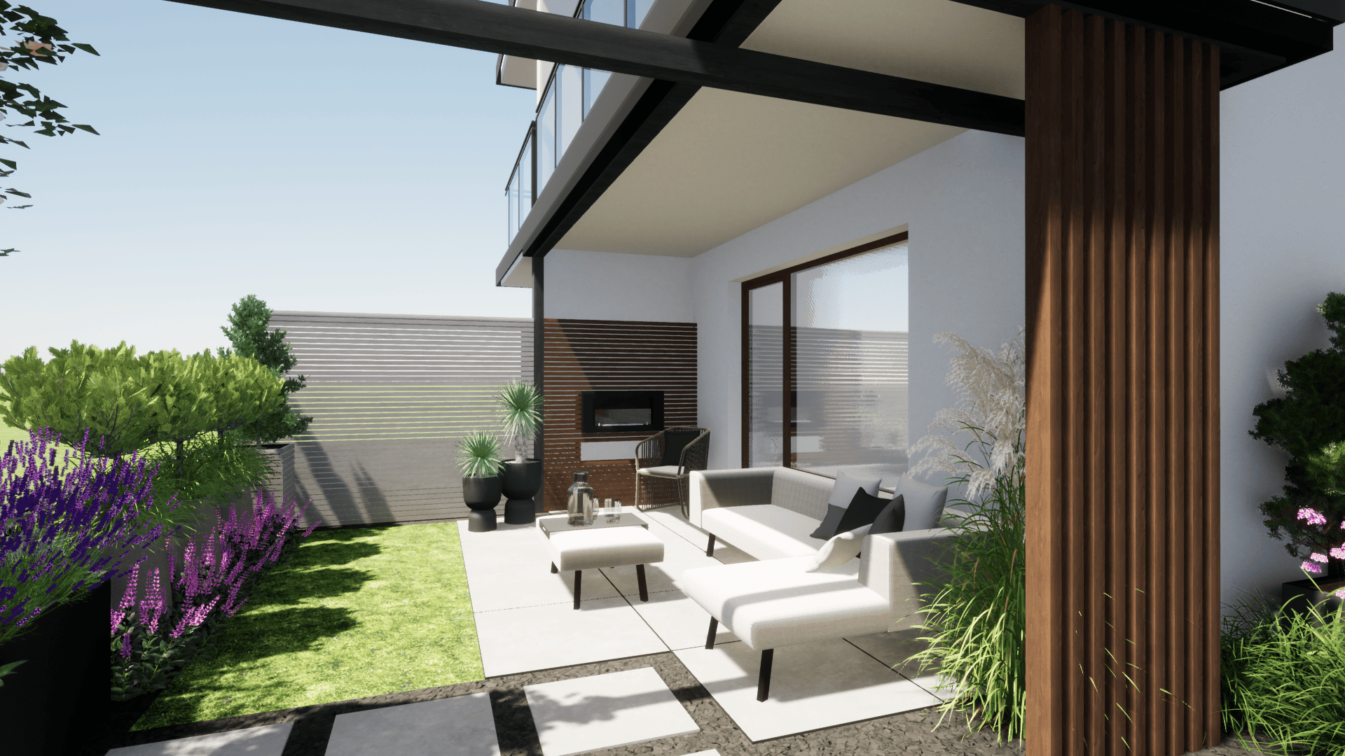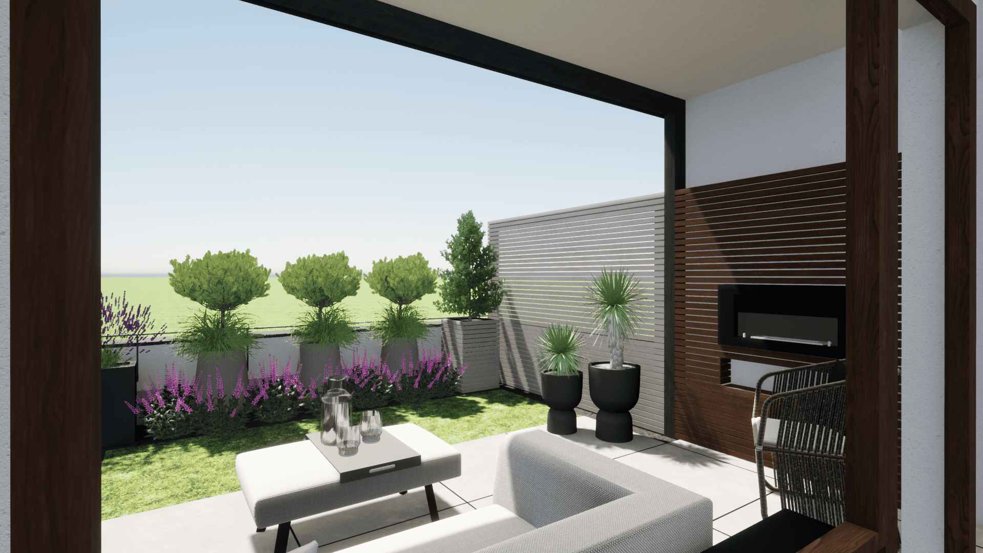 Opis: projekt narożnego tarasu w nowoczesnej zabudowie osiedlowej, w którym ważne dla inwestora było stworzenie stref do wypoczynku oraz relaksu, wykorzystując ograniczoną przestrzeń do maksimum. Ze względu na charakter otoczenia kluczowe było wykorzystanie roślin w pojemnikach jako przesłony widoku z zewnątrz, zapewniającej prywatność i jednocześnie wprowadzającej miękkie formy do wnętrza przestrzeni.